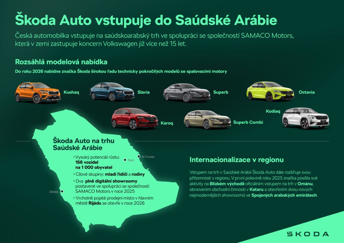 Posilnenie stratégie internacionalizácie vstupom na saudskoarabský trh značky ŠKODA AUTO pokračuje v spolupráci so spoločnosťou SAMACO Motors, ktorá tu už viac ako 15 rokov zastupuje aj ďalšie značky koncernu Volkswagen. Ponuka zahŕňa modely Octavia a SUV Kushaq, Karoq a Kodiaq. Čoskoro budú nasledovať modely Superb a Superb Combi. V roku 2026 rozšíri portfólio kompaktný sedan Slavia, aby vyšiel v ústrety miestnemu veľkému dopytu po vozidlách tohto typu. Prvé dva veľmi moderne pojaté predajné priestory sa otvoria do konca roka v Džidde a Al-Chubare a vrcholný showroom v Rijáde bude nasledovať v roku 2026.