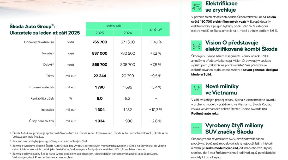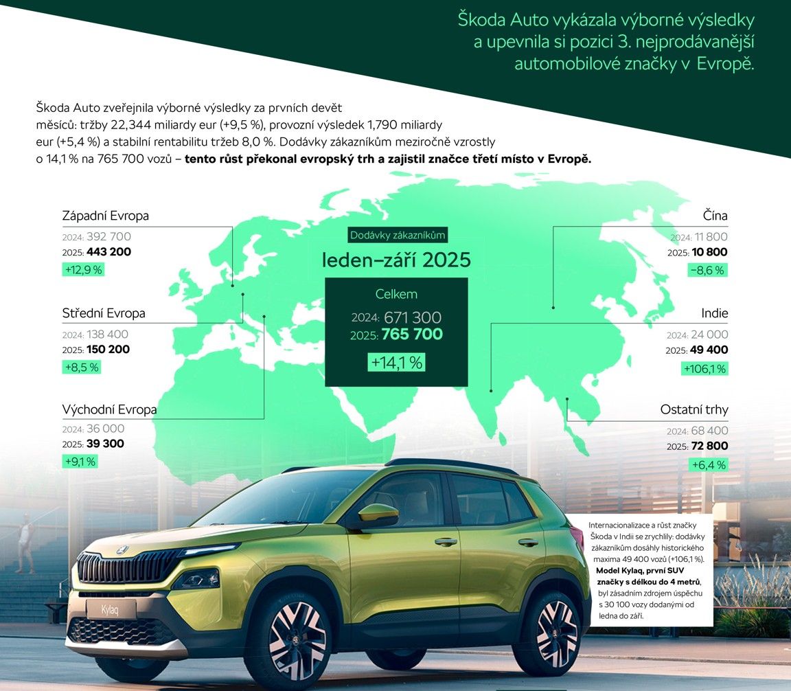 Mladoboleslavská automobilka ŠKODA AUTO dodala za prvé tri štvrťroky zákazníkom po celom svete celkom 765 700 vozidiel (pred rokom to bolo 671 300). O medziročný nárast 14,1 % sa zaslúžil väčší odbyt na významných trhoch v Európe a tiež v Indii, ale aj doteraz najširšia a najmodernejšia modelová ponuka obsahujúca všetky typy pohonov. Český výrobca vďaka tomu rastie rýchlejšie ako celkový trh a zostáva treťou najpredávanejšou značkou v Európe (EÚ 27 + 4). Strategickým cieľom značky je byť v Európe do roku 2030 trvalo medzi tromi najžiadanejšími výrobcami.