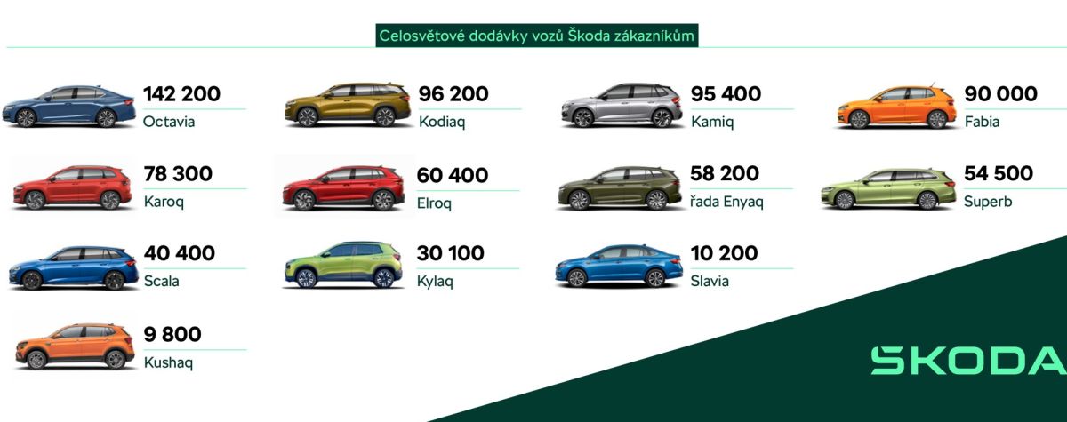 Zákazníkom po celom svete bolo dodaných 765 700 vozidiel, čo znamená medziročný nárast o 14,1 %. V Európe (zahŕňa EÚ 27, Spojené kráľovstvo, Švajčiarsko, Nórsko a Island) česká značka ŠKODA dodala 616 300 vozidiel a obhájila svoju tretiu pozíciu absolútne! Podiel plne elektrických (BEV) a plug-in hybridných vozidiel (PHEV) tvoria v tomto regióne už 24,1 % dodávok (pred rokom: 11,1 %), navyše modely Elroq a Enyaq sú tu na 3. a 6. mieste medzi elektromobilmi. Elroq navyše prekonal zlomovú hranicu 100 000 objednávok od zahájenia predaja. V plnom prúde je aj internacionalizácia značky. V Indii ŠKODA dosiahla historické maximum so 49 400 dodanými vozidlami (+106,1 %) a vo Vietname bola počas roka spustená výroba modelu Kushaq, od septembra sa tu vyrába aj predáva aj sedan Slavia.